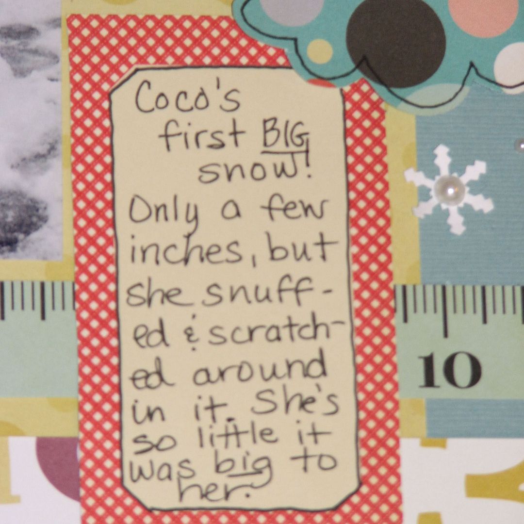 Here's my layout for Cosmo Cricket's Winter Challenge. Playing in the snow is always fun, but it's a riot watching Coco checking it all out for the first time. She was hilarious yesterday in the ice. She was too light to punch through the top layer, so she was skating all over on her way to the tiny patch I cleared for her to go potty. After the first couple of trips I just gave in and carried her.